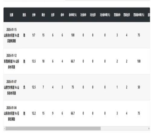 北京时间1月15日,WCBA常规赛,山东女篮85-76击败武汉盛帆女篮,这场比赛中国女篮超级新星张子宇登场9分42秒,6中6,拿到15分5篮板,命中率100%,这场比赛张子宇打出了他登陆WCBA最高效的一场比赛。